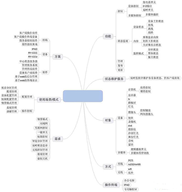 组成:展厅中央控制系统一般由四部分组成—1. 用户界面 2.中央控制主机 3.各类控制接口 4.受控设备